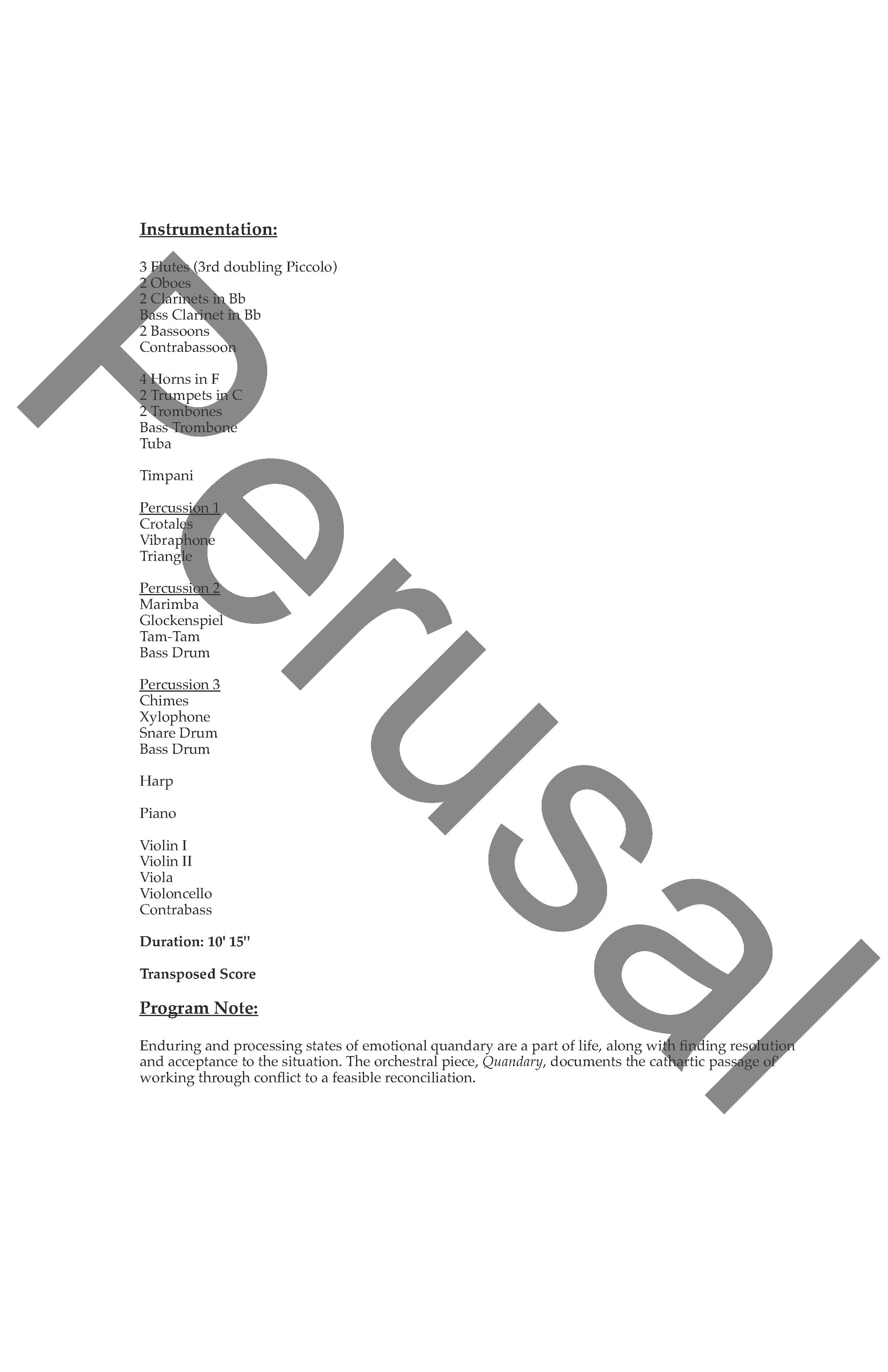 Enduring and processing states of emotional quandary are a part of life, along with finding resolution and acceptance to the situation. The orchestral piece, Quandary, documents the cathartic passage of working through conflict to a feasible reconciliation.